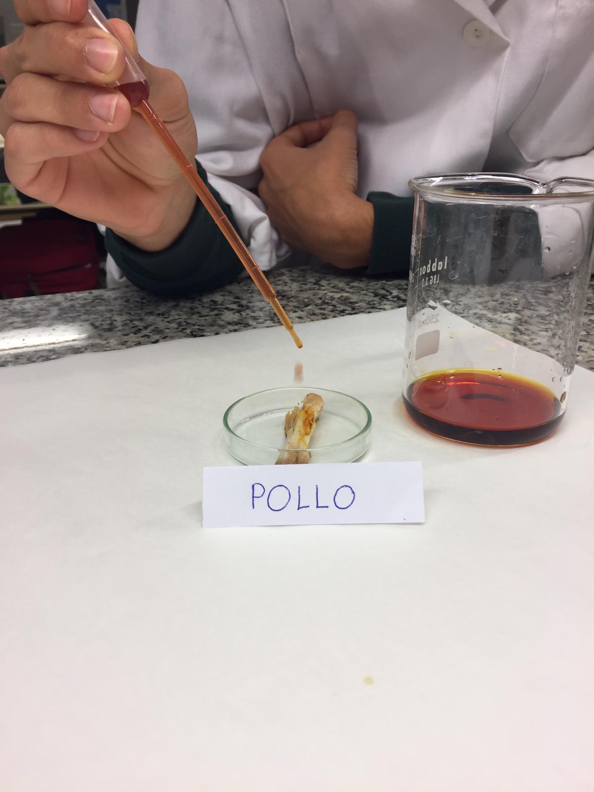 Foto 7: Se vierte el Lugol sobre una muestra de pollo, Ahinoa, 18/12/2018