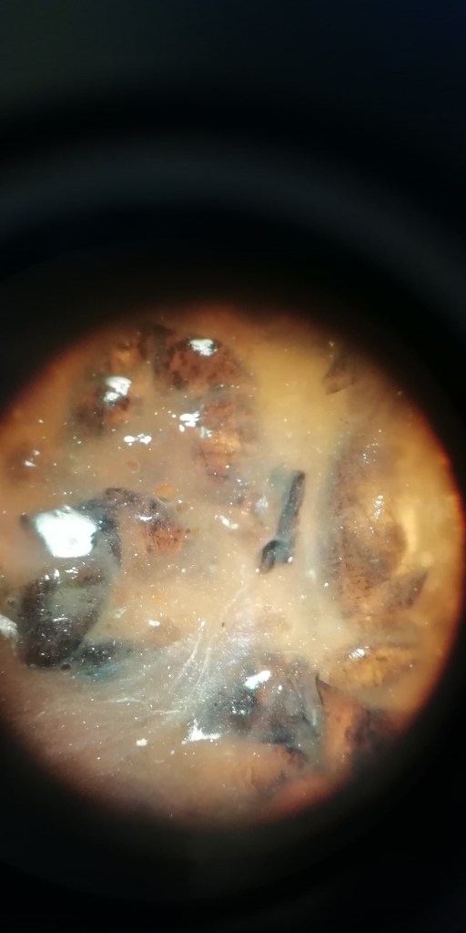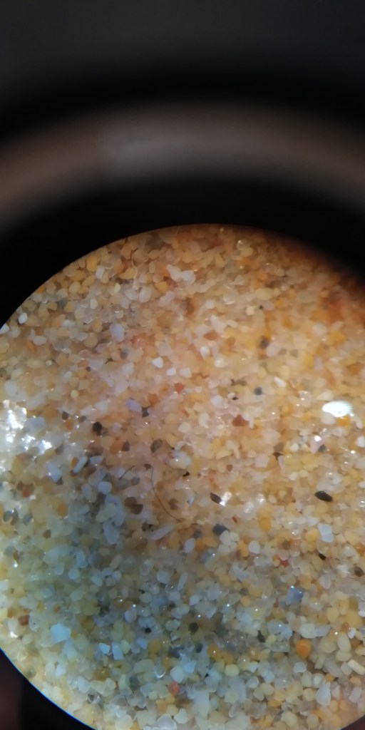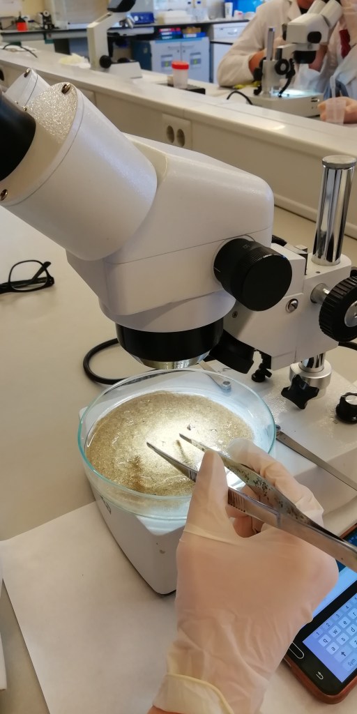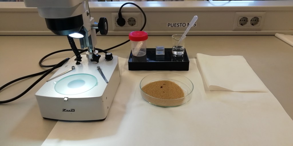 Para realizar la práctica primero pusimos las muestras de arena sobre el vidrio reloj. Después, las humedecimos con ayuda del cuenta gotas para que los microplásticos que pudiesen encontrarse en ellas flotasen. Por último, procedimos a buscar microplásticos en las lupas.