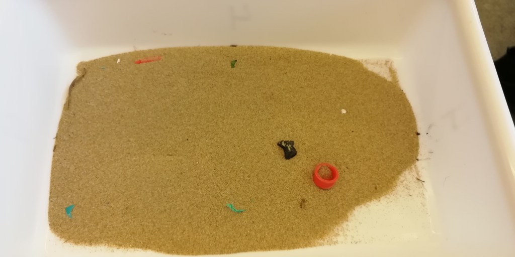 Tras unos 20 minutos de búsqueda encontramos la primera fibra de plástico. Por lo que podemos deducir que, a pesar de que limpiamos la playa y la arena de las muestras ya estaba previamente filtrada, no pudimos eliminar todos los plásticos que había en Arenales.