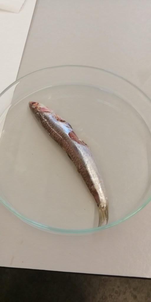 En primer lugar, abrir el boquerón por el estómago con la ayuda de un bisturí. Después, extraer todo el aparato digestivo del animal. Colocar las vísceras obtenidas en el paso anterior en una placa Petri y triturarlas con el bisturí. Por último, usar la lupa, para localizar microplásticos, y el microscopio, para observarlos con una mayor calidad.