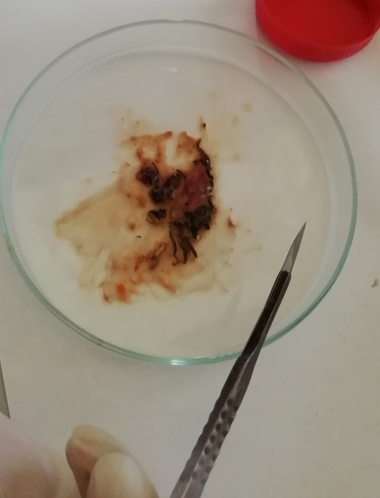 - Se cortan los alimentos con un bisturí y se colocan en una placa petri.