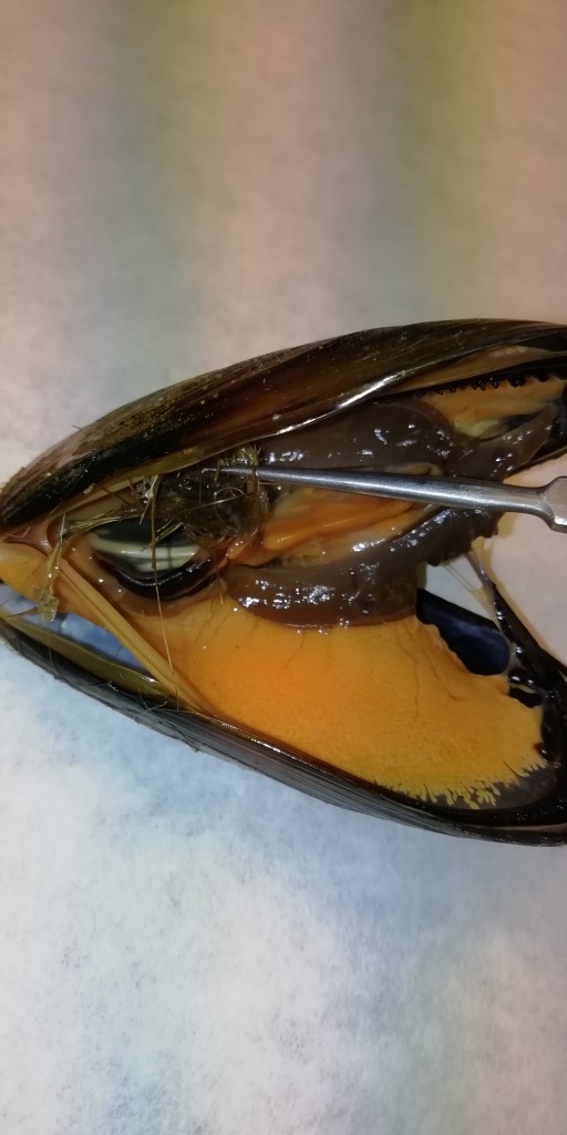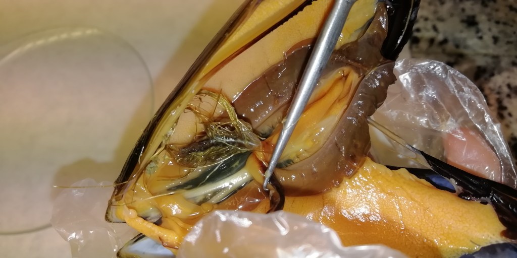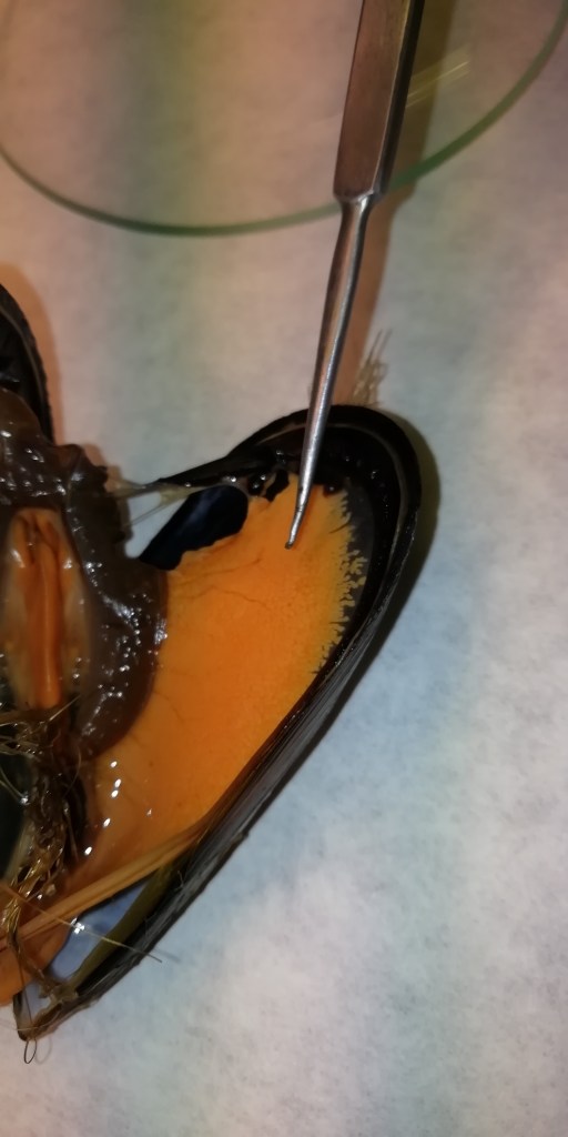Esta fue una práctica de anatomía de bivalvos en la que observamos algunos mejillones por dentro.